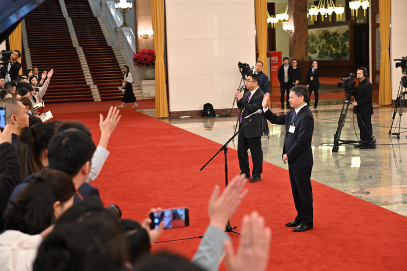 3月8日,第十四届全国人民代表大会第二次会议第二场“部长通道”集中采访活动在北京人民大会堂举行。这是工业和信息化部部长金壮龙向记者挥手致意。