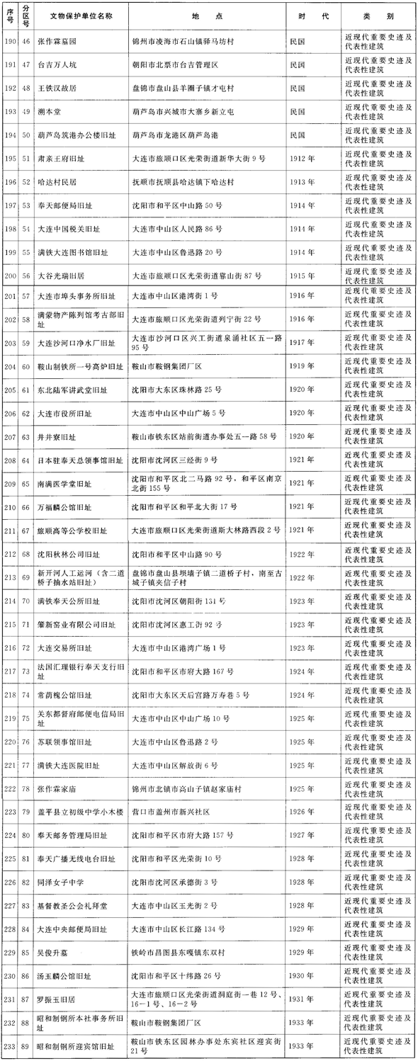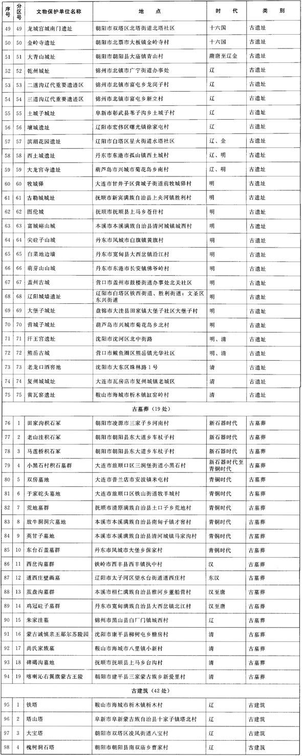 各市人民政府,省政府各厅委、各直属机构: 根据《中华人民共和国文物保护法》的规定,现将辽宁省第九批省级文物保护单位予以公布。 各市政府要贯彻落实“保护为主,抢救第一,合理利用,加强管理”的文物工作方针,严格按照文物保护单位“四有”(有保护范围、有标志说明、有记录档案、有专门机构或者专人负责管理)的工作要求,认真做好新公布的省级文物保护单位的保护管理工作。 附件:辽宁省第九批省级文物保护单位名单