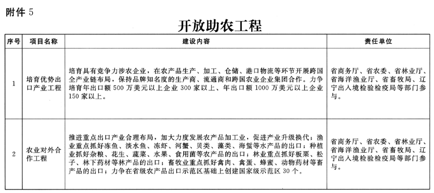 (四)开放助农工程。开放是农业现代化的必由之路,进一步扩大农业对外开放,全面实施农业“引进来、走出去”“一带一路”倡议,打造辐射东北、面向全国、融入国际的农业对外开放新格局。着力加强农业对外交流合作,提高全省农业统筹利用国际国内两个市场、两种资源的能力和农业利用外资水平。加大品种、技术、设施、装备和人才引进力度,加快提高农业科技和装备水平,加强农产品生产、贸易等环节的对外合作,建设国际标准农产品生产示范区和基地。加快形成开放有序、交流顺畅、融合共享的外向型农业新格局,为全省农业转变发展方式、深化农业供给侧结构性改革、增加农民收入开辟新领域。
