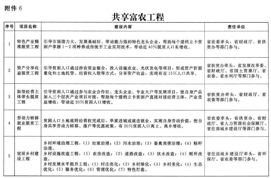 (五)共享富农工程。共享是农业现代化的本质要求,加快补齐农业农村短板,始终坚持工业反哺农业、城市支持农村,促进城乡公共资源均衡配置、城乡要素平等交换,稳步提高城乡基本公共服务均等化水平。进一步加大强农惠农富农政策力度,让广大农民平等参与现代化进程、共同分享现代化成果,着力构建机会公平、服务均等、成果普惠的农业发展新体制,不断促进农民收入持续增长,让农民生活得更有尊严、更加体面。到2020年,实现贫困县初步形成优势特色产业体系,贫困乡镇、贫困村特色产业增加值显著提升,每个建档立卡贫困户掌握1—2项实用技术。通过财政涉农资金投入设施农业、养殖、光伏、乡村旅游等项目形成的资产折股量化以及土地托管、吸引土地经营权入股等方式,让贫困户分享更多资产收益。