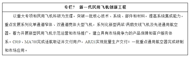 (二)实现航空产业新突破。加强自主创新,推进民用航空产品产业化、系列化发展,加强产业配套设施和安全运营保障能力建设,提高产品安全性、环保性、经济性和舒适性,全面构建覆盖航空发动机、飞机整机、产业配套和安全运营的航空产业体系。到2020年,民用大型客机、新型支线飞机完成取证交付,航空发动机研制实现重大突破,产业配套和示范运营体系基本建立。