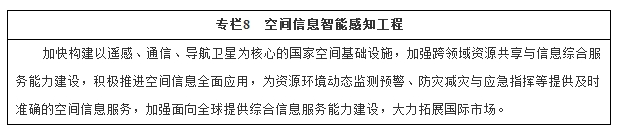 加快卫星及应用基础设施建设。构建星座和专题卫星组成的遥感卫星系统,形成“高中低”分辨率合理配置、空天地一体多层观测的全球数据获取能力;加强地面系统建设,汇集高精度、全要素、体系化的地球观测信息,构建“大数据地球”。打造国产高分辨率商业遥感卫星运营服务平台。发展固定通信广播、移动通信广播和数据中继三个卫星系列,形成覆盖全球主要地区的卫星通信广播系统。实施第二代卫星导航系统国家科技重大专项,加快建设卫星导航空间系统和地面系统,建成北斗全球卫星导航系统,形成高精度全球服务能力。采用政府和社会资本合作(PPP)模式推进遥感卫星等建设。