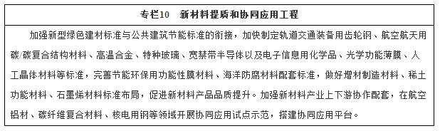推动新材料产业提质增效。面向航空航天、轨道交通、电力电子、新能源汽车等产业发展需求,扩大高强轻合金、高性能纤维、特种合金、先进无机非金属材料、高品质特殊钢、新型显示材料、动力电池材料、绿色印刷材料等规模化应用范围,逐步进入全球高端制造业采购体系。推动优势新材料企业“走出去”,加强与国内外知名高端制造企业的供应链协作,开展研发设计、生产贸易、标准制定等全方位合作。提高新材料附加值,打造新材料品牌,增强国际竞争力。建立新材料技术成熟度评价体系,研究建立新材料首批次应用保险补偿机制。组建新材料性能测试评价中心。细化完善新材料产品统计分类。