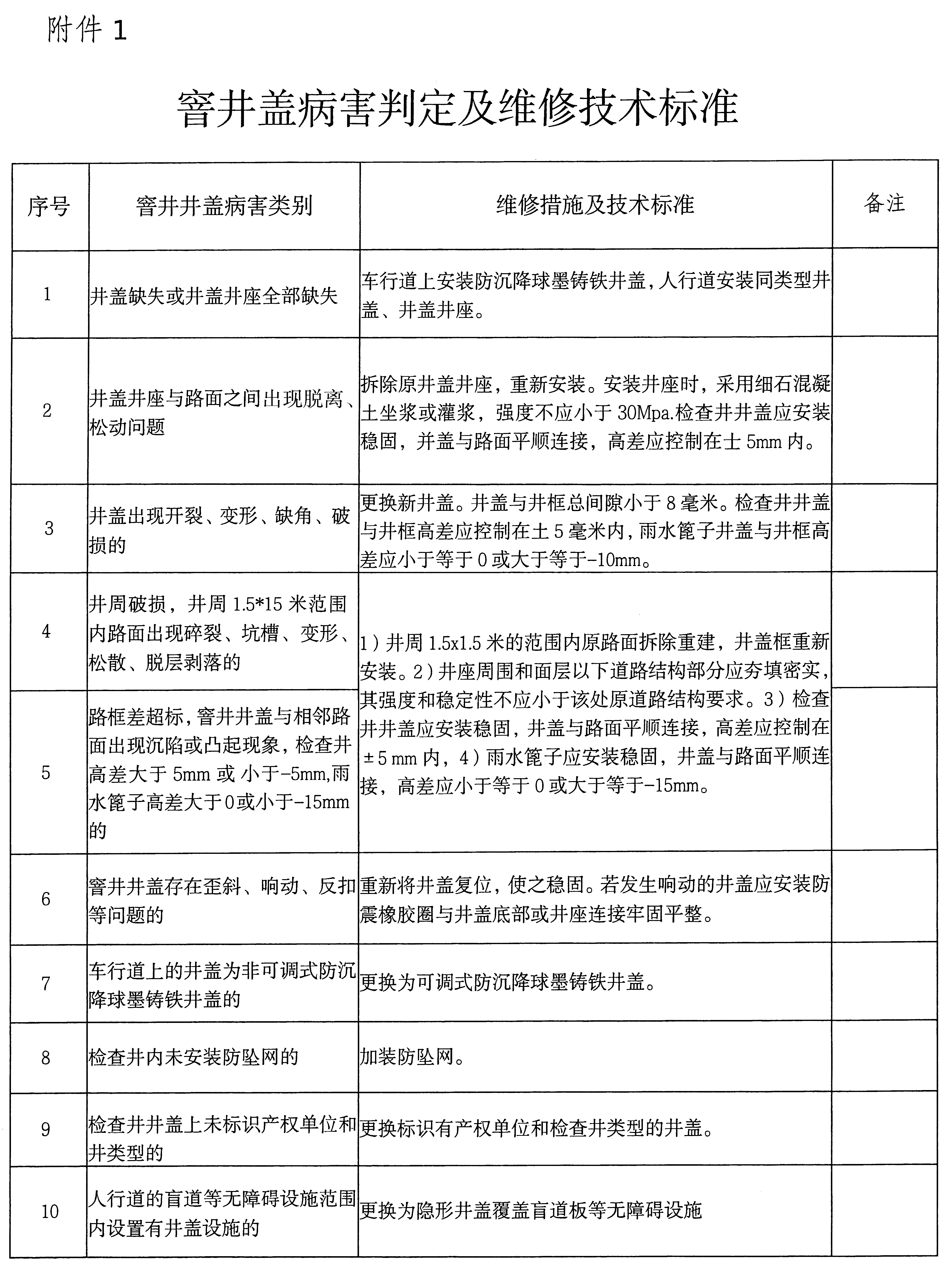 (三)开展治理,确保安全运行。各地要开展窨井盖治理专项行动,压实窨井盖权属单位主体责任,全面排查、消除窨井盖存在的安全隐患。权属单位要建立问题清单,制定限期整改计划,确保整改到位。对存在破损、下沉、松动等情形的窨井盖,要尽快维修加固;对窨井盖缺失的,要及时按相关标准补装;对低洼、易涝等地区的窨井,要逐步加装防坠装置;对已确认为废弃的窨井,要限期完成填埋。在专项行动基础上,窨井盖权属单位要制定窨井盖更新改造计划,逐步更换超出设计使用年限、材质落后的窨井盖。
