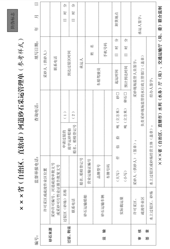 河道砂石采运管理单应当格式统一、内容统一,参考样式附后。河道砂石采运管理单分纸质管理单、电子管理单两种形式,各省、自治区、直辖市可结合实际决定采用任一种形式,鼓励采用电子管理单。采用纸质管理单的,应当设置必要的防伪标志,由省级水行政主管部门组织统一印制、严格保管、按需使用;采用电子管理单的,由省级水行政主管部门会同交通运输等有关主管部门建设河道砂石采运管理信息系统,统一平台、授权登录、分级审核。先行采用纸质管理单的省份,要结合实际逐步向电子管理单过渡,2024年年底前全面实行电子管理单。