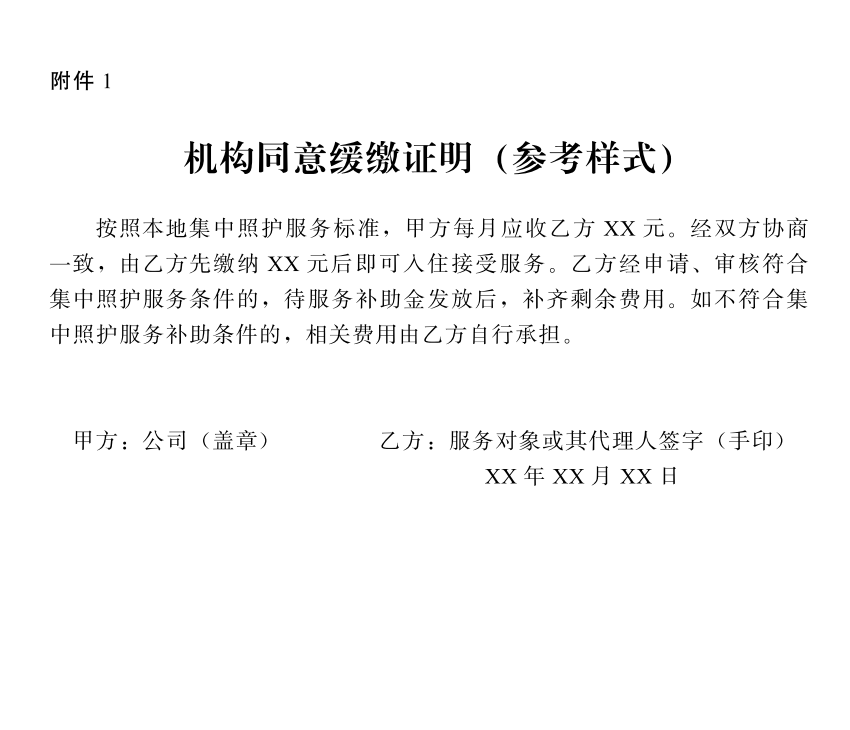 1.自愿入住养老机构。经济困难失能老年人等群体可根据自身情况和个人意愿选择入住承担集中照护服务的养老机构。失能老年人入住机构时需向养老机构提供老年人能力评估有效证明,“老年父母+残疾子女”家庭中重度残疾人入住机构时需向养老机构提供残疾证。养老机构应按照集中照护服务标准收住经济困难失能老年人等群体,双方签订养老服务协议,按月收取集中照护服务费。对缴纳集中照护服务费有困难的,双方协商一致后,签订《机构同意照护服务费缓缴证明》,经济困难失能老年人等群体可先行入住养老机构。
