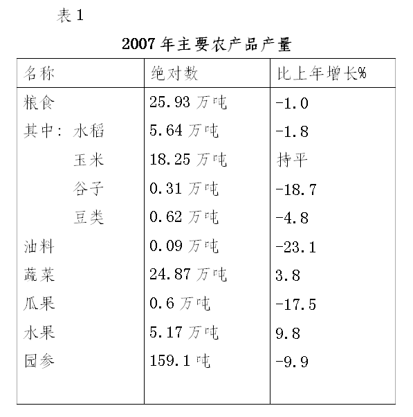 全年粮食总产量25.93万吨,比上年下降1.0%,其中,水稻产量5.64万吨,比上年下降1.7%,玉米产量18.25万吨,与上年持平,谷类产量0.31万吨,比上年增长18.7%,豆类产量0.62万吨,比上年下降4.8%。在非粮食作物中,油料产量0.09万吨,比上年下降23.1%,蔬菜产量24.87万吨,比上年增长3.8%,瓜果产量0.63万吨,比上年下降17.5%,水果产量5.17万吨,比上年增长9.8%,园参产量159.1吨,比上年下降9.9%。