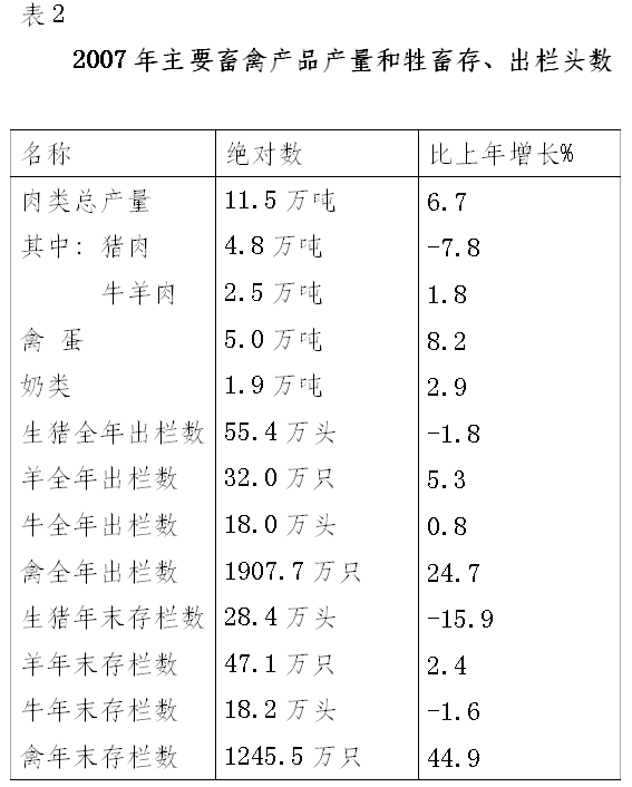 全年肉类总产量11.5万吨,比上年增长6.5%;禽蛋产量5.0万吨,比上年增长8.2%;奶类总产量1.9万吨,比上年增长2.9%。