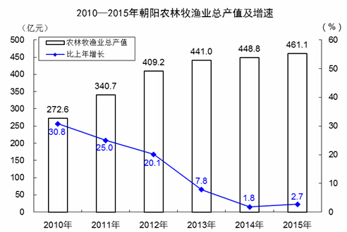 全年农林牧渔业总产值461.1亿元,比上年增长2.7%。其中,种植业产值223.0亿元,增长7.5%;林业产值35.8亿元,增长1.5%;牧业产值192.2亿元,下降2.4%;渔业产值0.7亿元,增长33.7%。