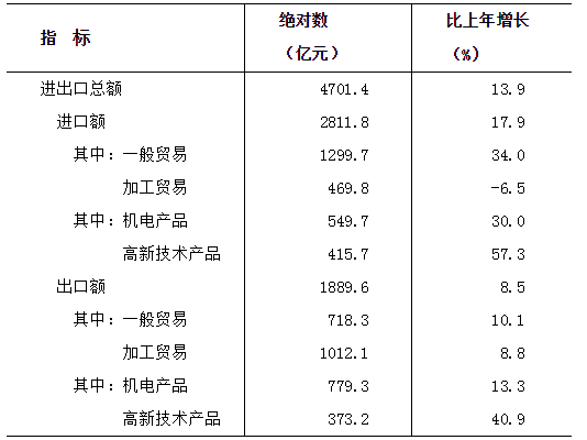 全年进出口总额4701.4亿元,比上年增长13.9%。其中,进口2811.8亿元,增长17.9%;出口1889.6亿元,增长8.5%。机电产品出口779.3亿元,增长13.3%,占41.2%。一般贸易出口718.3亿元,增长10.1%,占38.0%。民营企业出口661.2亿元,增长14.3%,占35.0%。前六大主要出口市场是日本、美国、韩国、中国台湾、中国香港、德国。