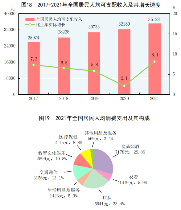全年全国居民人均可支配收入35128元,比上年增长9.1%,扣除价格因素,实际增长8.1%。全国居民人均可支配收入中位数[53]29975元,增长8.8%。按常住地分,城镇居民人均可支配收入47412元,比上年增长8.2%,扣除价格因素,实际增长7.1%。城镇居民人均可支配收入中位数43504元,增长7.7%。农村居民人均可支配收入18931元,比上年增长10.5%,扣除价格因素,实际增长9.7%。农村居民人均可支配收入中位数16902元,增长11.2%。城乡居民人均可支配收入比值为2.50,比上年缩小0.06。按全国居民五等份收入分组[54],低收入组人均可支配收入8333元,中间偏下收入组人均可支配收入18445元,中间收入组人均可支配收入29053元,中间偏上收入组人均可支配收入44949元,高收入组人均可支配收入85836元。全国农民工人均月收入4432元,比上年增长8.8%。全年脱贫县[55]农村居民人均可支配收入14051元,比上年增长11.6%,扣除价格因素,实际增长10.8%。