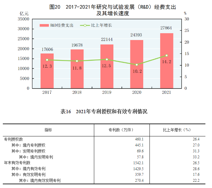 全年研究与试验发展(R&D)经费支出27864亿元,比上年增长14.2%,与国内生产总值之比为2.44%,其中基础研究经费1696亿元。国家自然科学基金共资助4.87万个项目。截至年末,正在运行的国家重点实验室533个,纳入新序列管理的国家工程研究中心191个,国家企业技术中心1636家,大众创业万众创新示范基地212家。国家科技成果转化引导基金累计设立36支子基金,资金总规模624亿元。国家级科技企业孵化器[60]1287家,国家备案众创空间[61]2551家。全年授予专利权460.1万件,比上年增长26.4%;PCT专利申请受理量[62]7.3万件。截至年末,有效专利1542.1万件,其中境内有效发明专利270.4万件。每万人口高价值发明专利拥有量[63]7.5件。全年商标注册773.9万件,比上年增长34.3%。全年共签订技术合同67万项,技术合同成交金额37294亿元,比上年增长32.0%。