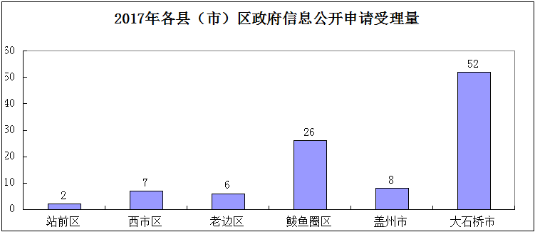 2017年,全市共受理政府信息公开申请127件,同比上升115.3%。其中,市本级受理26件,县(市)区受理101件。内容主要涉及土地征收、房屋拆迁、规划许可等相关信息。按申请方式看,当面申请79件,网络申请5件,传真申请0件,信函申请43件。从办结情况看,答复率为100%,其中属于主动公开、同意公开和部分公开的76件,占59.8%;不同意公开的7件,占5.5%;不属于本行政机关公开(告知通过其他途径办理)的26件,占20.5%;申请信息不存在的18件,占14.2%;告知作出更改补充的0件,占0%。