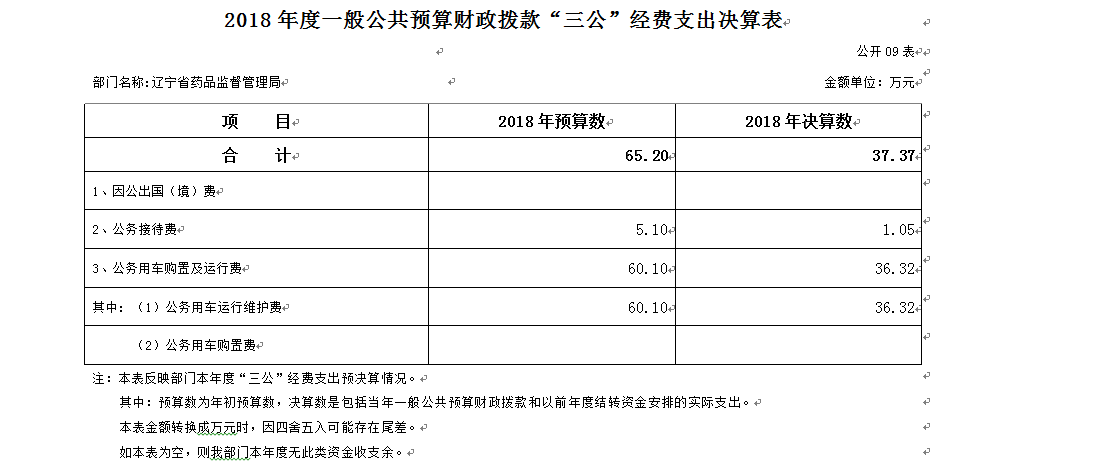 2018年度一般公共预算财政拨款安排的“三公”经费支出37.37万元,完成年初预算的57.32%,决算数小于年初预算数的主要原因是辽宁省机构改革原所属事业单位划转至其他单位。其中:因公出国(境)费0万元,公务接待费1.05万元,公务用车购置及运行维护费36.32万元。